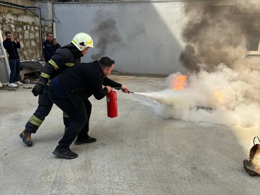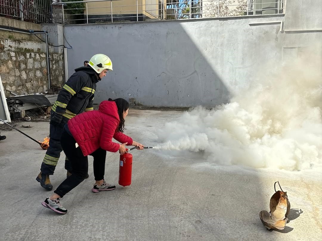 Tatbikat sırasında personel, gerçek yangın senaryolarında olduğu gibi yangın tüpleriyle müdahalede bulunarak öğrendiklerini pekiştirdi.