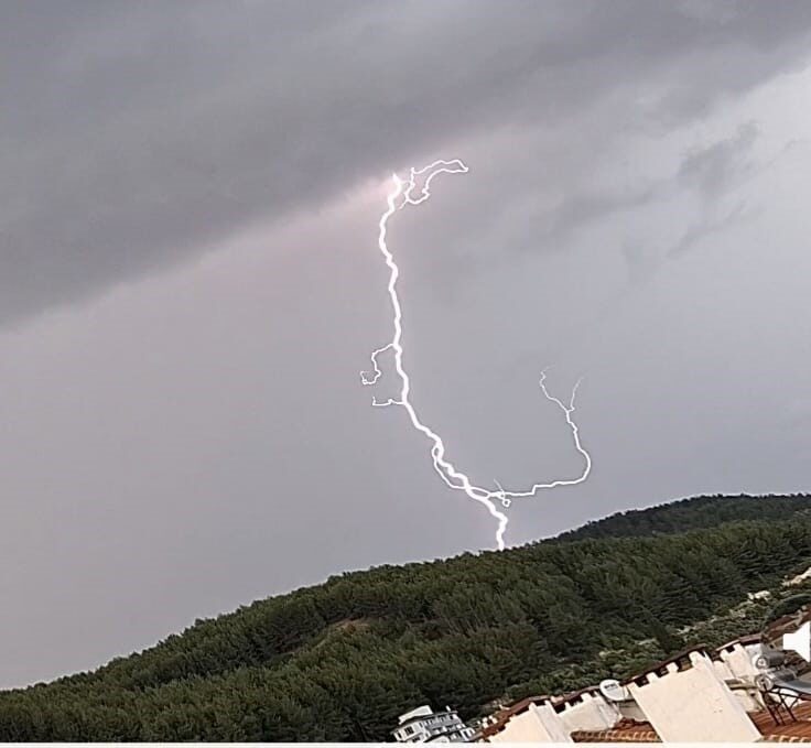 Muğla’nın Menteşe ilçesinde etkili olan gök gürültülü sağanak yağış sırasında dağa düşen bir şimşek, böyle görüntülendi.