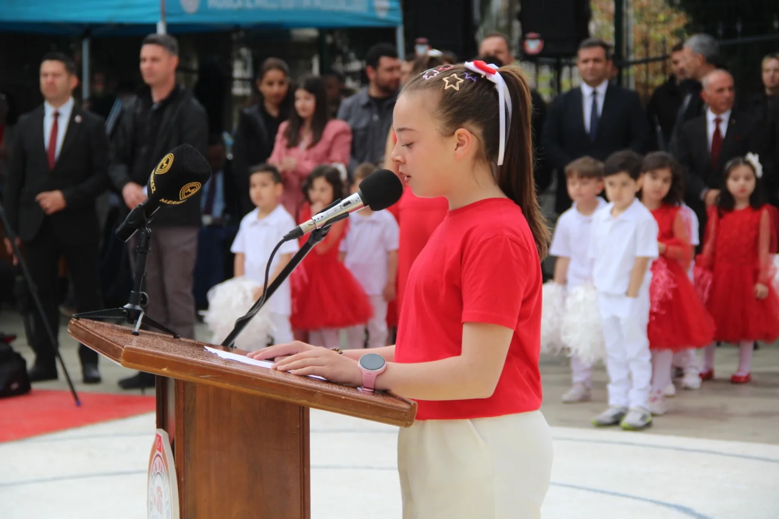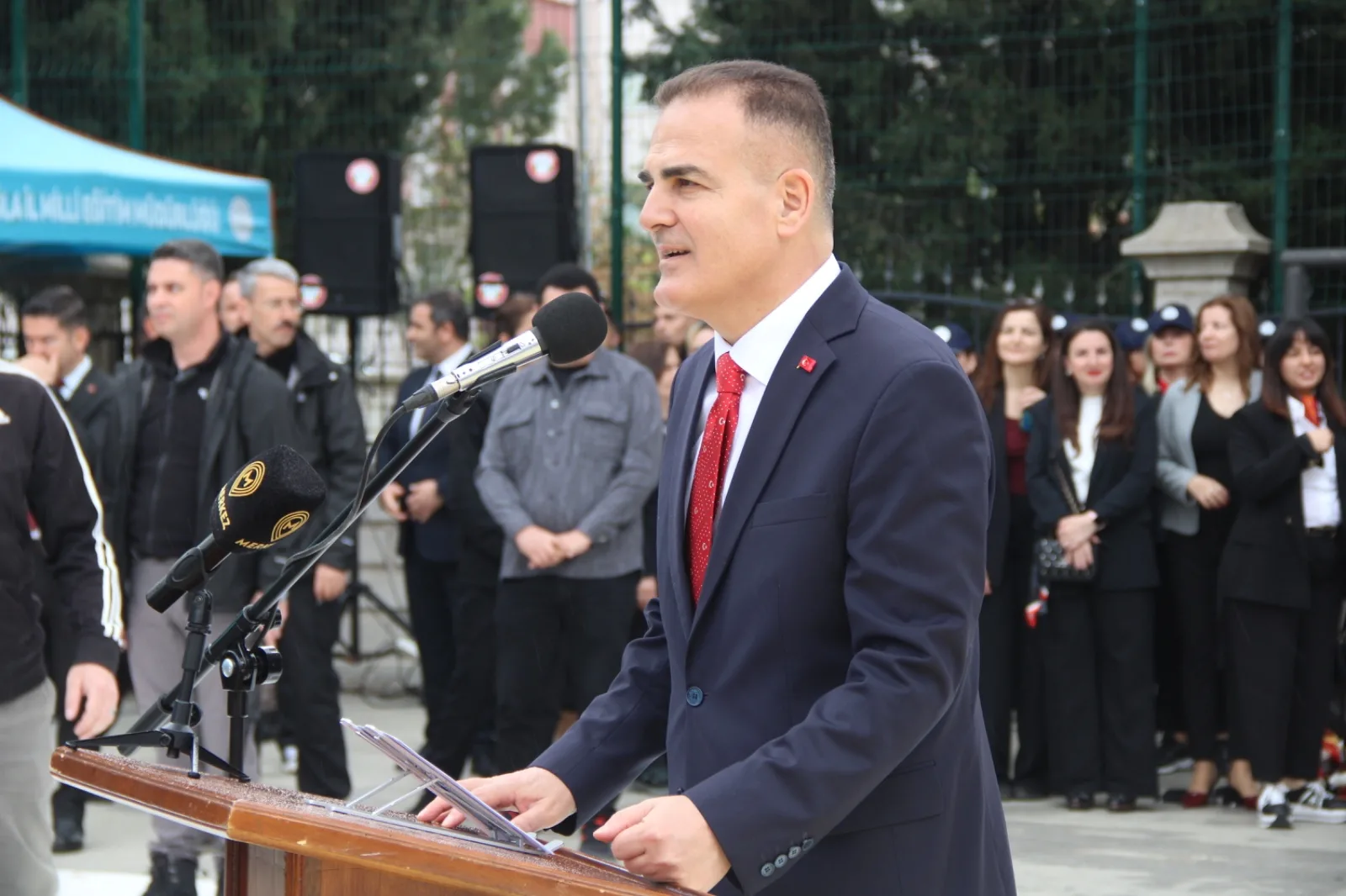 Törende konuşan Muğla İl Milli Eğitim Müdürü Emre Çay, 23 Nisan’ın millet iradesinin simgesi olduğunu vurgulayarak, “Tarihimizin en kritik dönüm noktası olan Türkiye Büyük Millet Meclisi’nin açılışının 106. yılını idrak etmenin onurunu ve sorumluluğunu taşıyoruz” dedi.