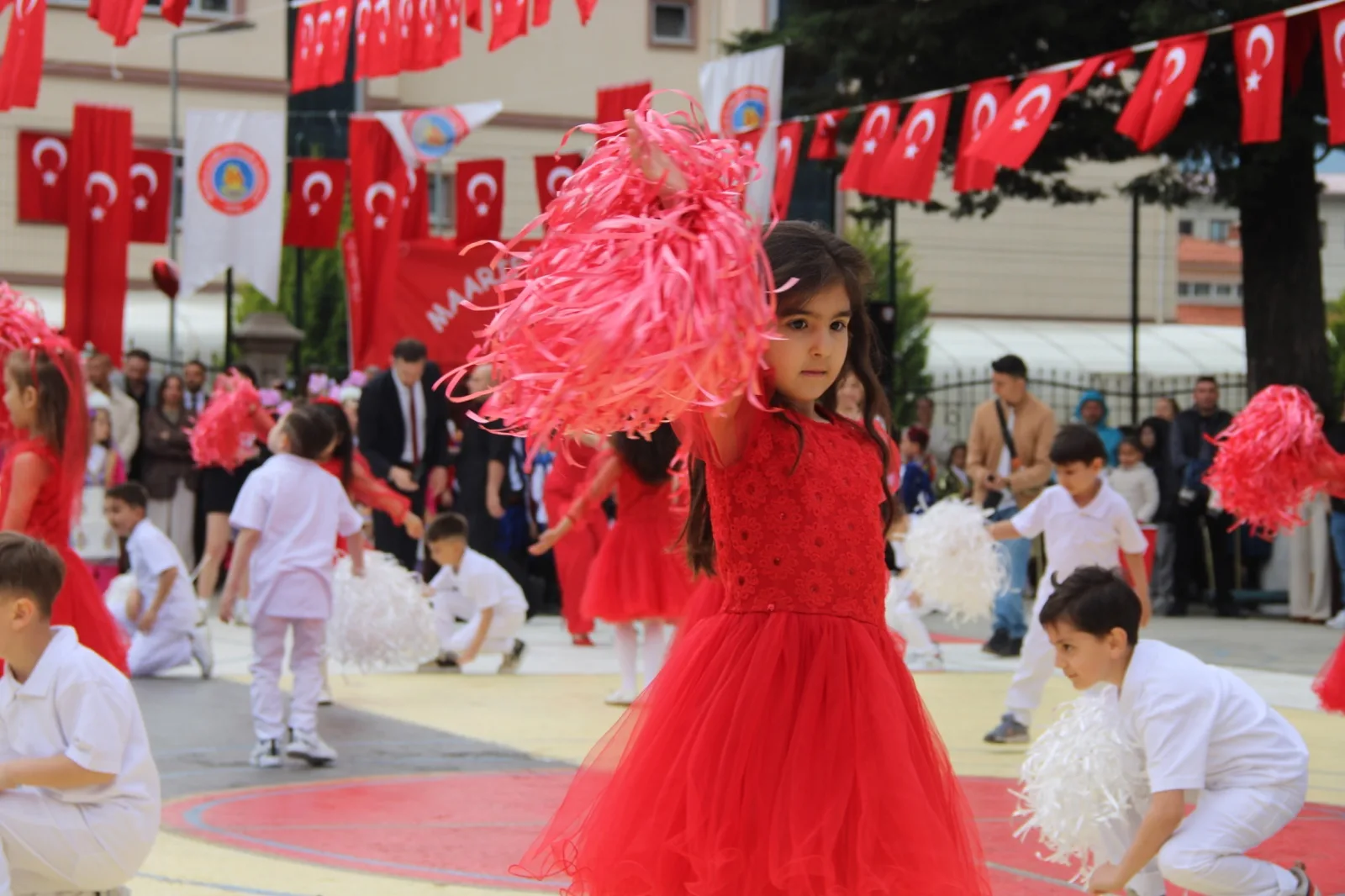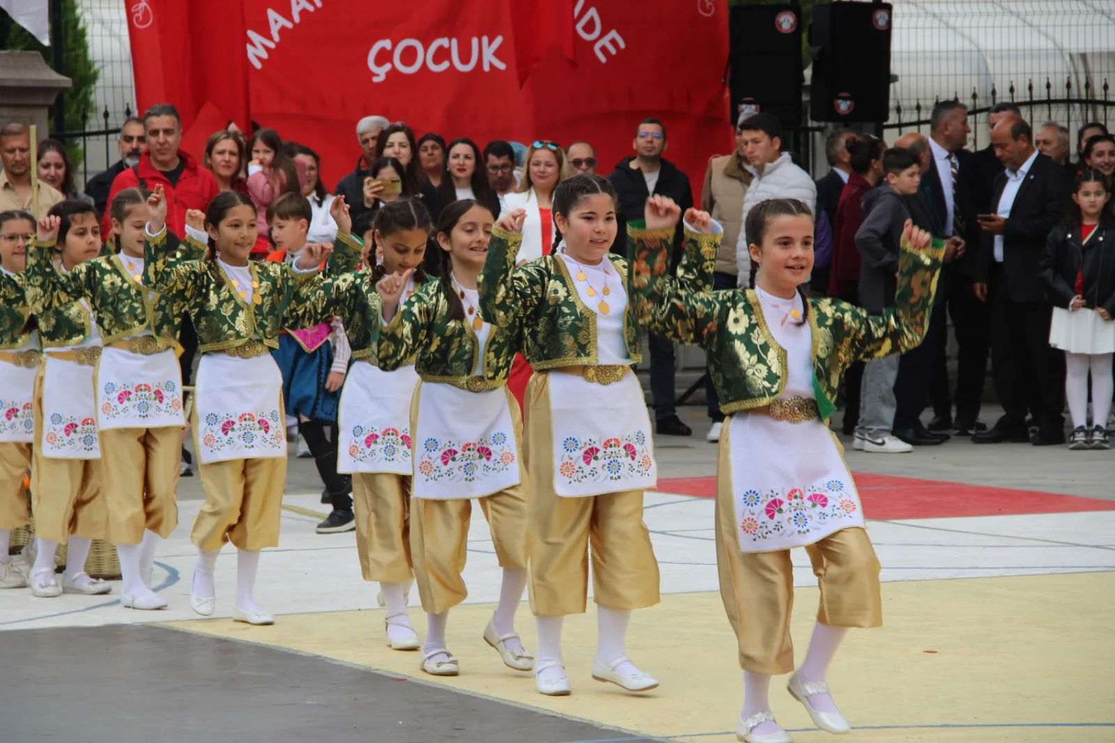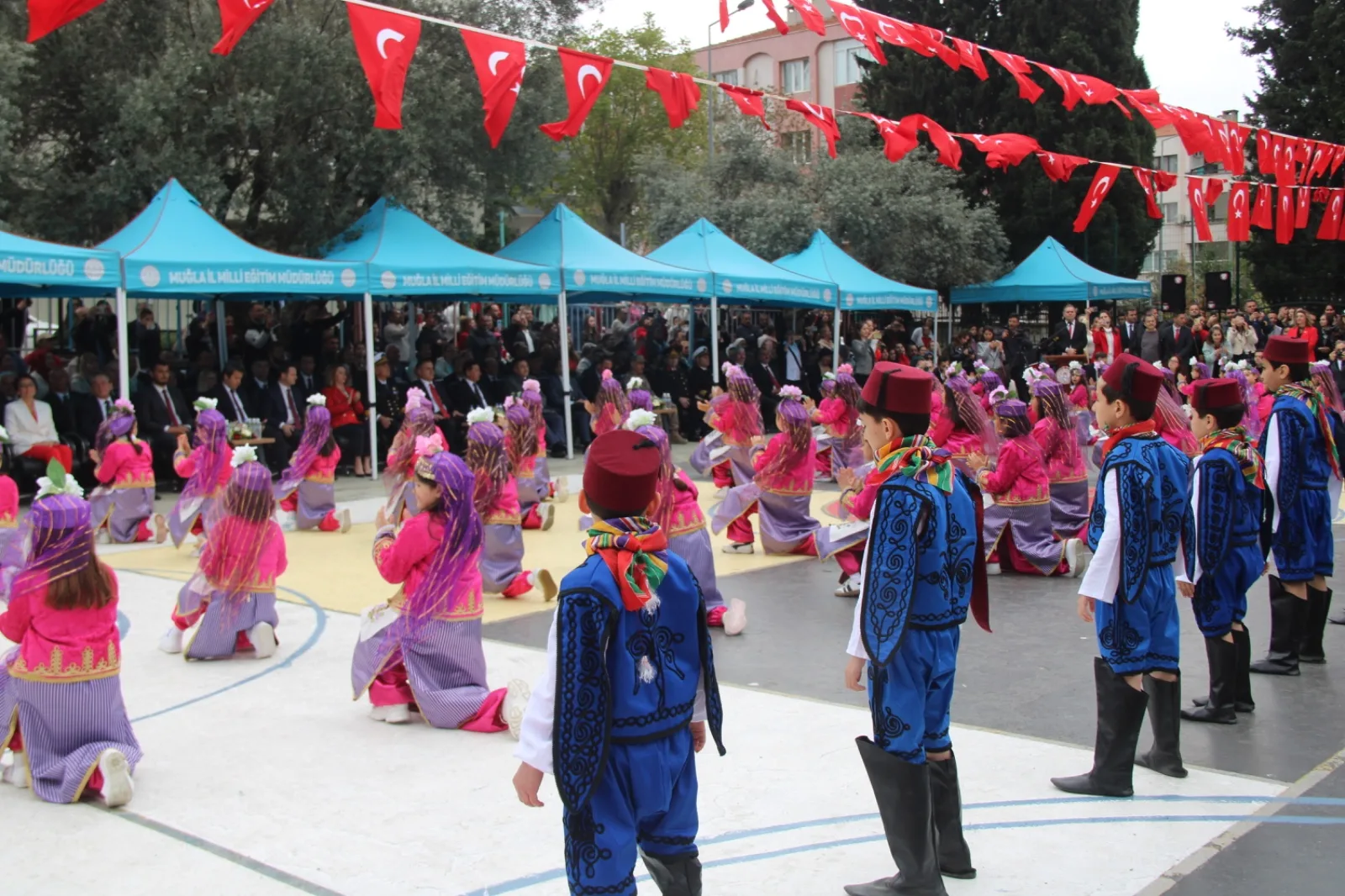Resmi konuşmaların ardından sahneye çıkan ilkokul öğrencileri, hazırladıkları halk oyunları, dans gösterileri ve çeşitli performanslarla bayram sevincini doyasıya yaşattı. Öğrencilerin sergilediği gösteriler protokol üyeleri ve vatandaşlar tarafından ilgiyle takip edilirken, sık sık alkışlarla desteklendi.