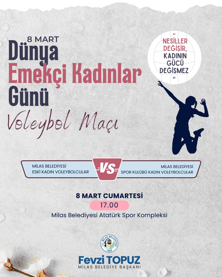 Milas Belediyesi tarafından ‘Nesiller Değişir Kadının Gücü Değişmez’ sloganıyla düzenlenecek olan gösteri maçında Milas Belediyespor Kadın Voleybol Takımı ve Milas Belediyespor Kadın Voleybol Takımı’nda geçmişte yer almış kadın oyuncular seyircilere eğlence dolu bir müsabaka izlettirecek.