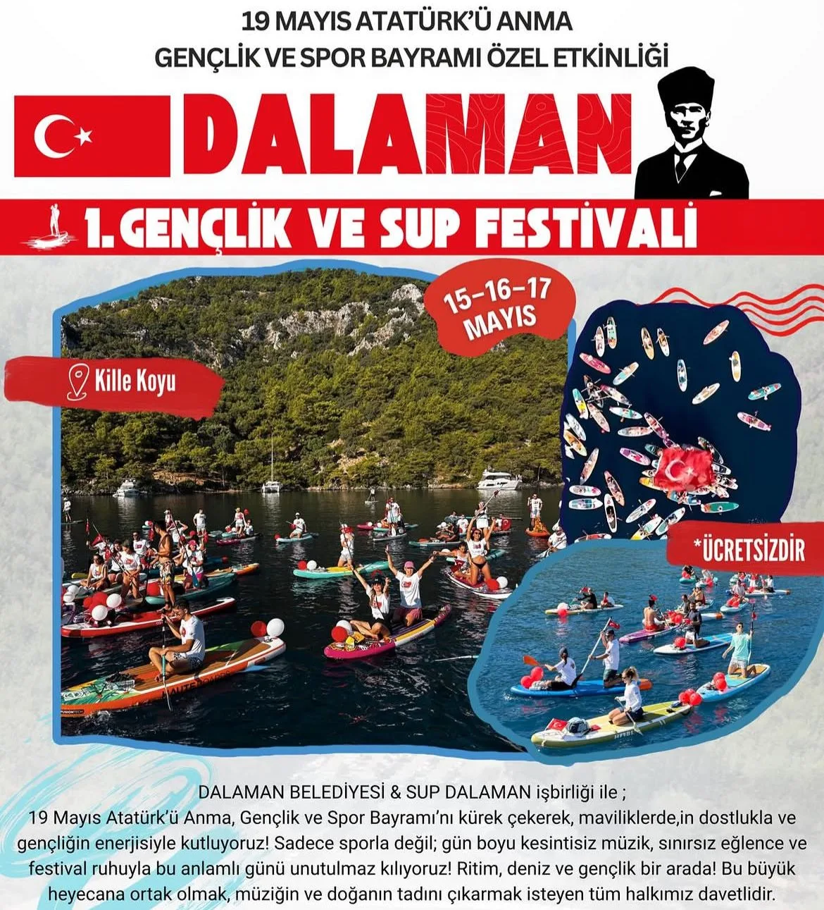 Dalaman Belediyesi ile SUP Dalaman iş birliğinde düzenlenen 1. Gençlik ve SUP Festivali, 15-16-17 Mayıs 2026 tarihlerinde Kille Koyu’nda gerçekleştirilecek. Üç gün sürecek etkinliğe tüm vatandaşlar davet edildi.