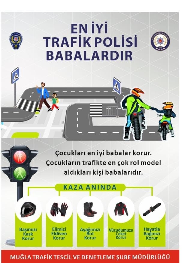 Muğla genelinde artan motosiklet sayısı ile birlikte, motosiklet kazalarının azaltılması amacıyla Muğla İl Emniyet Müdürlüğü tarafından “En İyi Trafik Polisi Babalardır” projesi hayata geçirildi. Bu projede, çocukların trafikte en büyük rol modelleri olan babaların trafik eğitimindeki etkisine dikkat çekiliyor.