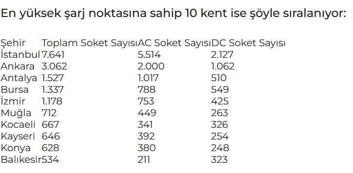 En yüksek araç şarj noktası olan iller ise 7 bin 641 ile İstanbul, 3 bin 62 ile Ankara, 1527 ile Antalya, 1337 ile Bursa ve 1178 ile İzmir oldu.