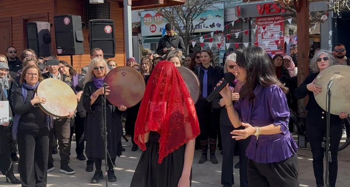Ritim dinletisinin sonunda ise anlamlı bir performans sahnelendi. Sahneye çıkan genç bir kızın başındaki kırmızı gelin örtüsü, türkünün finalinde çıkarıldı. Elinde kitapla meydanda duran genç kız, özgürlüğü ve kadınların eğitimle güçlenmesini simgeleyen bir mesaj verdi.