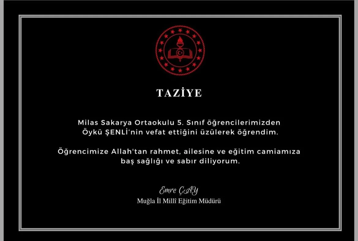 “Milas Sakarya Ortaokulu 5. sınıf öğrencilerimizden Öykü Şenli’nin vefat ettiğini üzülerek öğrendim. Öğrencimize Allah’tan rahmet, ailesine ve eğitim camiamıza baş sağlığı ve sabır diliyorum.”