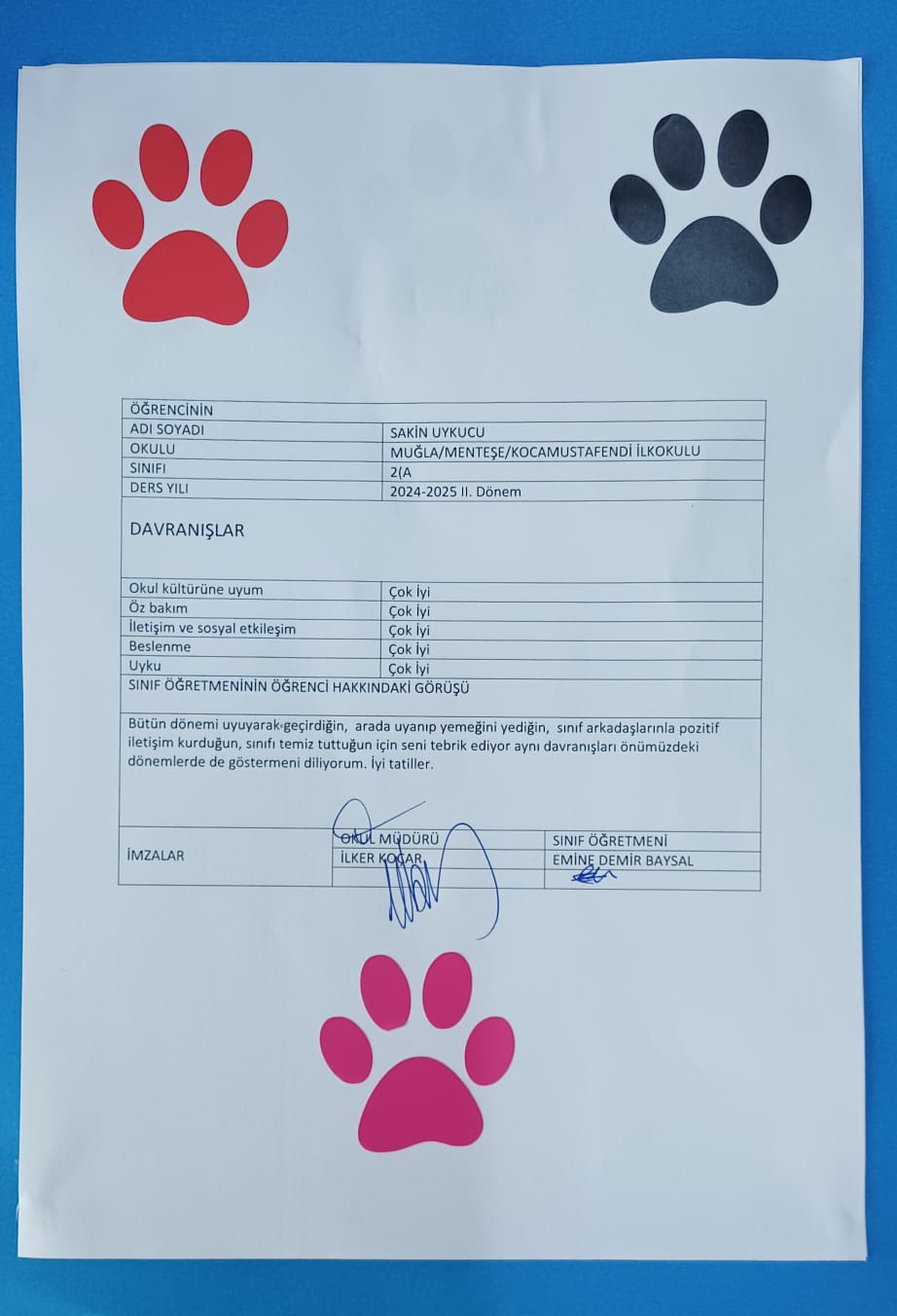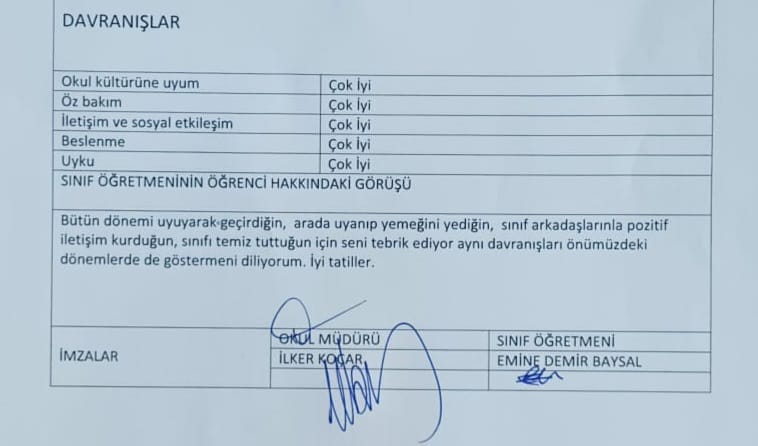 “Bütün öğrencilerimize iyi tatiller diliyorum, bugün karnelerini aldılar. Biraz dinlenme zamanı artık. Okulumuzda bir de Sakin isimli kedimiz var. 2-A sınıfı öğrencilerimizin sahiplendiği, aşılarını ve kontrollerini yaptırdığımız bir kedi. Çok sakin olduğu için adını da ‘Sakin’ koydular. Yemi, kumu okulda. Artık bizim kedimiz oldu. Ona da bir karne vermek istedik. Hoş bir anı olsun dedik. Gerçekten güzel bir anı oldu, öğrencilerimiz de çok mutlu oldu.”