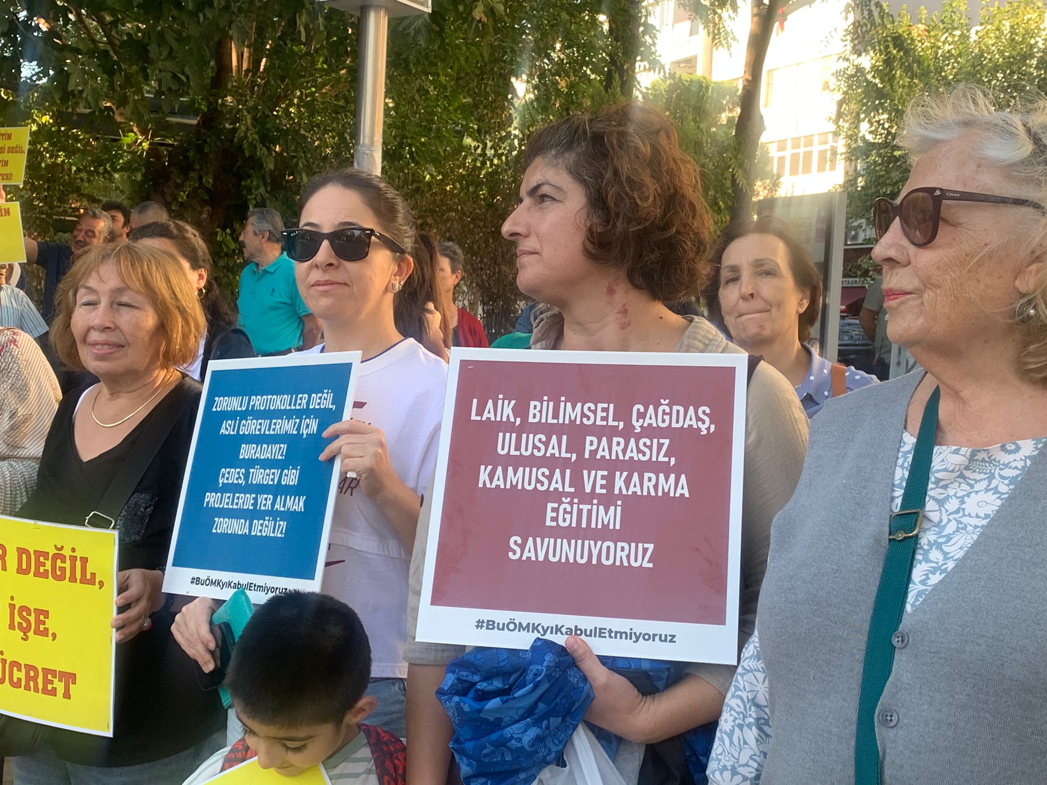 “Millî Eğitim Bakanlığı’nın (MEB), eğitimin bileşenlerinin görüşlerini almadan masa başında hazırladığı Öğretmenlik Mesleği Kanunu (ÖMK) geçtiğimiz yasama dönemi sonunda TBMM Genel Kurulu’nda görüşülmeye başlanmış ve kanunun ilk 22 maddesi bütün eleştiri ve itirazlara rağmen kabul edilmiştir. Eğitimin ana bileşenlerinden birisi olan eğitim ve bilim emekçilerini yok sayan, taleplerine ısrarla kulak tıkayan MEB, sürecin başından bu yana bildiğini okumaya devam etmeyi sürdürmektedir. Eğitim sendikalarının, halen görevde olan ve atama bekleyen bir milyonu aşkın öğretmenin taleplerini yok sayan ÖMK’ye yönelik eleştiri ve önerilerimizin ısrarla görmezden gelinmesi bizler açısından kabul edilemez bir durumdur. Öğretmenlik mesleğini itibarsızlaştıran ve emeğimizi değersizleştiren, ekonomik, sosyal ve mesleki sorunlarımıza çözüm üretmeyen, eşit işe eşit ücret ilkesini ortadan kaldıran, özlük haklarımızı zayıflatan, çalışanlar arasında ayrımcılığı ve eşitsizliği derinleştiren bir içeriğe sahip olan ÖMK’nin TBMM gündemine yeniden geleceği açıklanmıştır. Bugün burada Öğretmenlik Mesleği Kanunu teklifi ile ilgili itirazlarımızı sizlerle paylaşmak için toplandık. Bu teklif, öğretmenlerin mesleki haklarını güvence altına almak bir yana, bizi daha da zor şartlar altına sürükleyecek hükümler içermektedir” ifadelerine yer verdi.