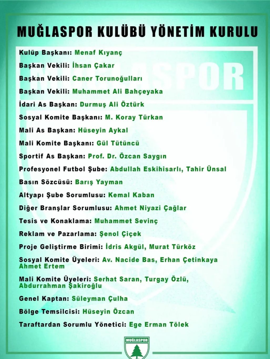 Muğlaspor Kulübü’nün yeni sezon öncesi yönetim kurulu görev dağılımı kamuoyuyla paylaşıldı. Kulüp Başkanı Menaf Kıyanç başkanlığında oluşturulan yönetimde, başkan vekilliklerine İhsan Çakar, Caner Torunoğulları ve Muhammet Ali Bahçeyaka getirildi.