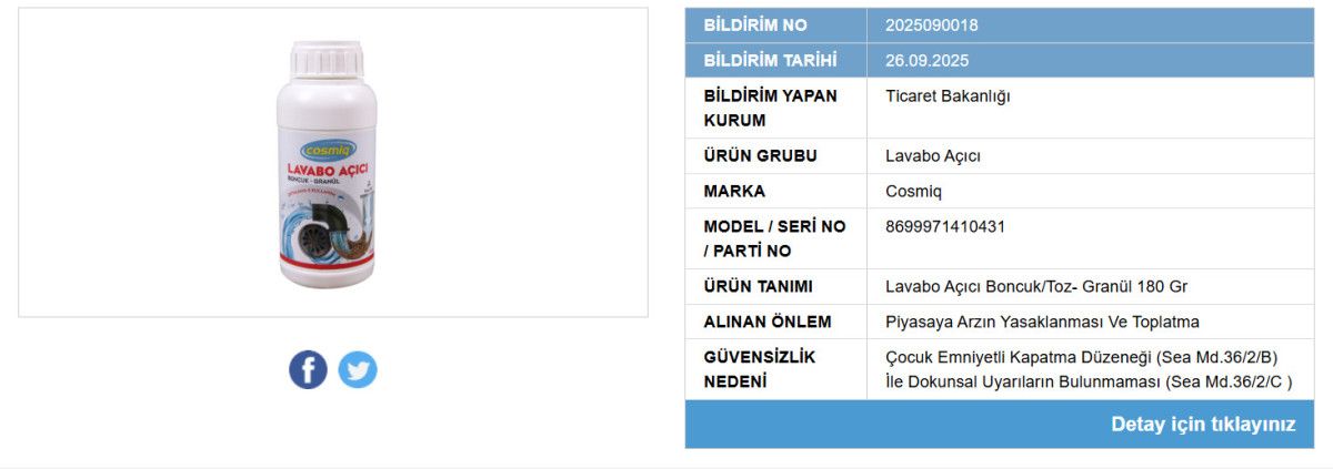 Bakanlık tarafından yapılan incelemeler sonucunda Cosmiq markasına ait ‘Lavabo Açıcı’lar “Çocuk Emniyetli Kapatma Düzeneğinin (Bknz.Sea Md.36/2/B) Bulunmaması” nedeniyle güvenlik riski oluşturduğu belirtildi.