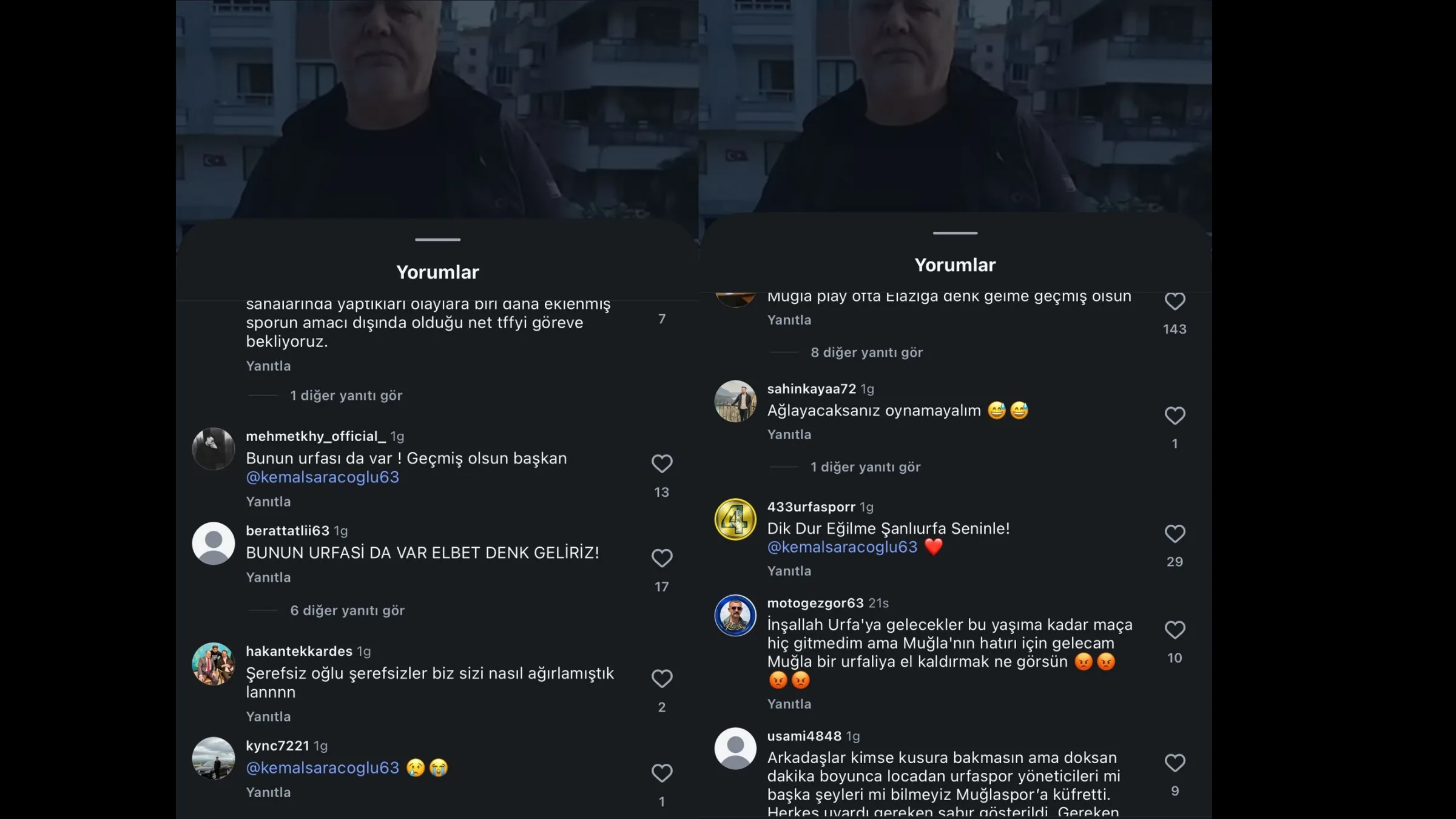 Sinkaf içeren bazı yorumlar dışında paylaşımın altına, “Bunun Urfa’sı da var, elbet denk geliriz”, “İnşallah Urfa’ya gelecekler, bu yaşıma kadar maça hiç gitmedim ama Muğla’nın hatırı için gelecem. Muğla Urfa’ya el kaldırmak ne görsün” gibi tehdit yorumları yapıldı.