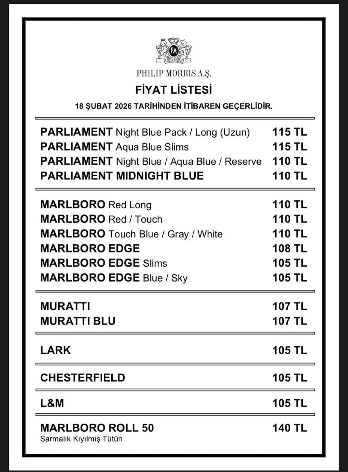 JTI grubunun ardından bir dev sigara grubu daha fiyatlarını güncelledi! Philip Morris (PM) grubu sigara fiyatlarına gelen dev zammın ardından en pahalı sigara 115 TL’ye yükseldi. İşte Marlboro, Parliament, Muratti ve Chesterfield 18 Şubat 2026 zamlı fiyat listesi…