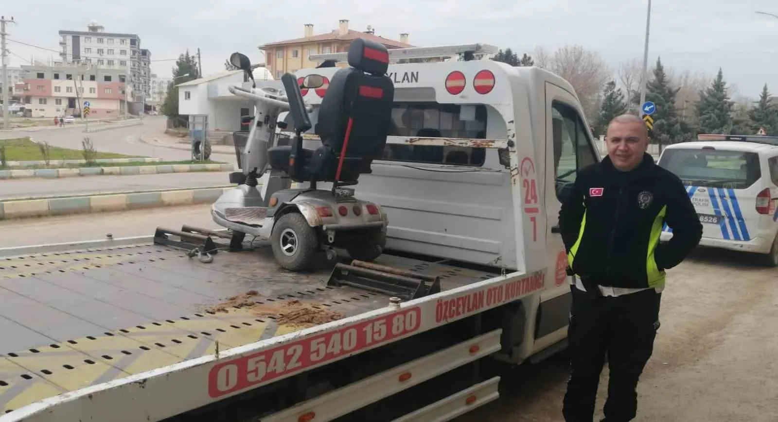 Engelli vatandaş sınavda olduğu sırada akülü tekerlekli sandalyesi çekiciye yüklenerek tamirciye görüldü. Lastiği tamir edilen tekerlekli sandalye, sınav sonrası salona götürülerek Hüseyin Adlin’e teslim alınarak edildi.