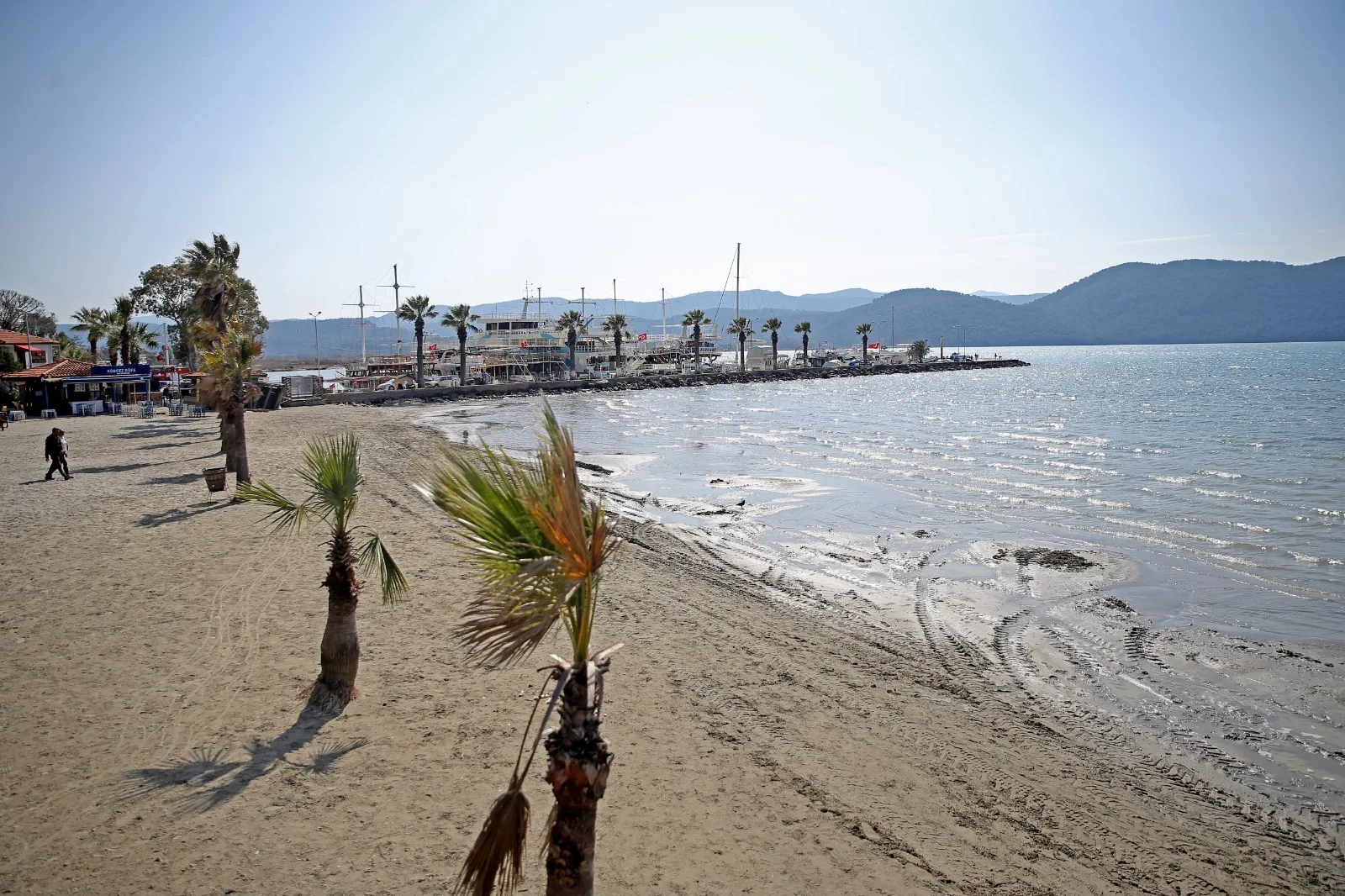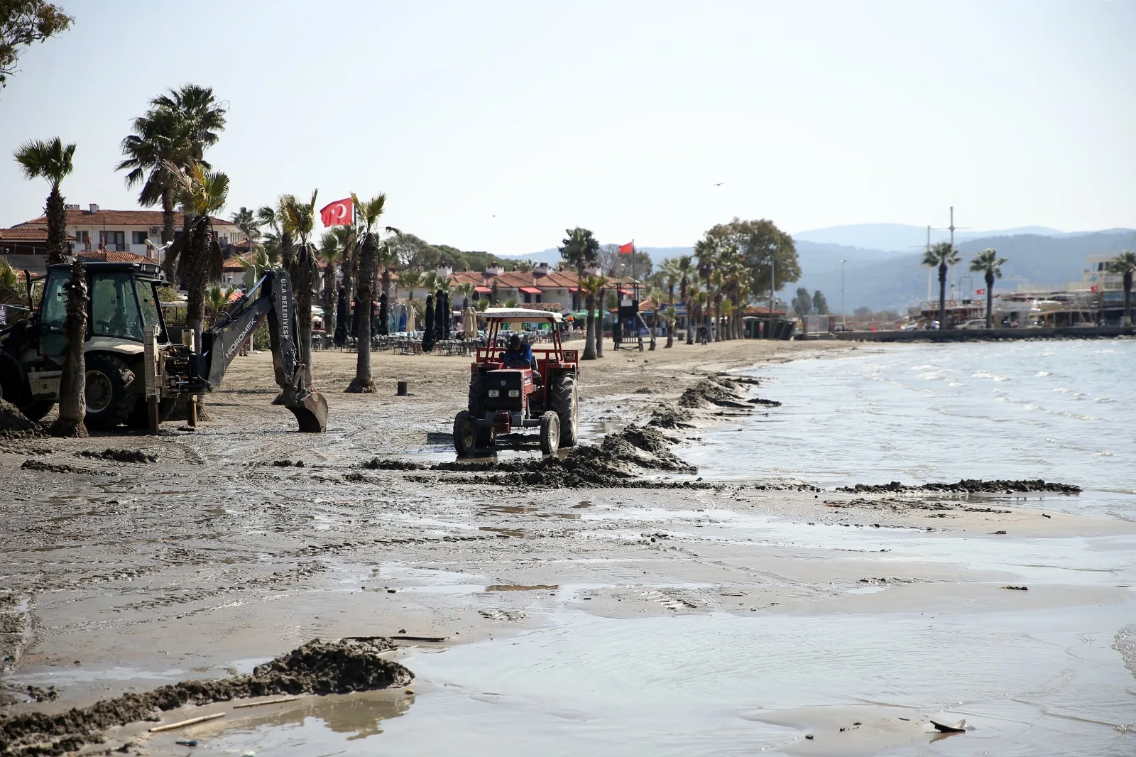 Muğla’nın Ula ilçesindeki Akyaka sahilinde deniz suyu kıyıdan yaklaşık 10 metre çekildi, belediye ekipleri sahilde düzenleme çalışması yaptı.