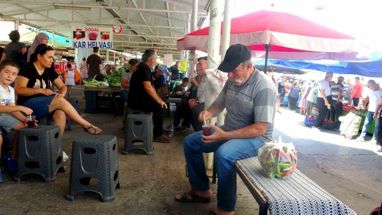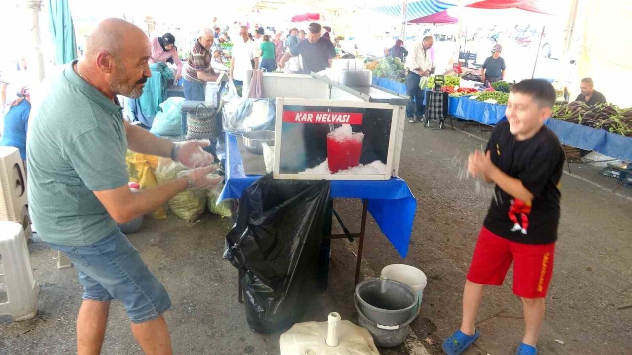 Meteoroloji Genel Müdürlüğü’nün uyarılarına göre sıcaklıkların 41 dereceyi bulduğu Muğla’da vatandaşlar, geleneksel serinleme yöntemi kar helvasına yoğun ilgi gösteriyor. Özellikle Menteşe ilçesindeki Perşembe Pazarı’nda satışa sunulan kar helvası, sıcak havadan etkilenen vatandaşların uğrak noktası oldu.