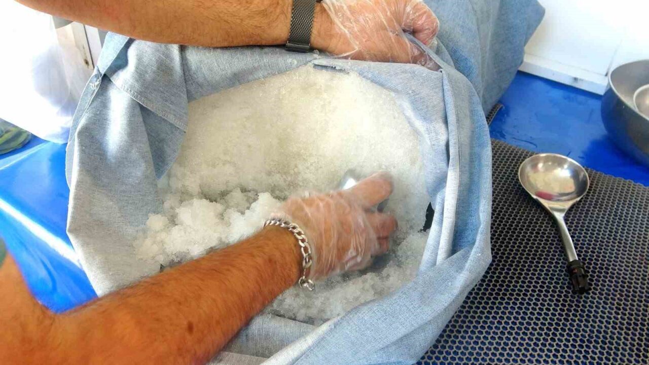 Hava sıcaklıklarının mevsim normallerinin üzerinde seyrettiği Muğla’da sıcaktan bunalan vatandaşlar kar helvasıyla serinliyor.