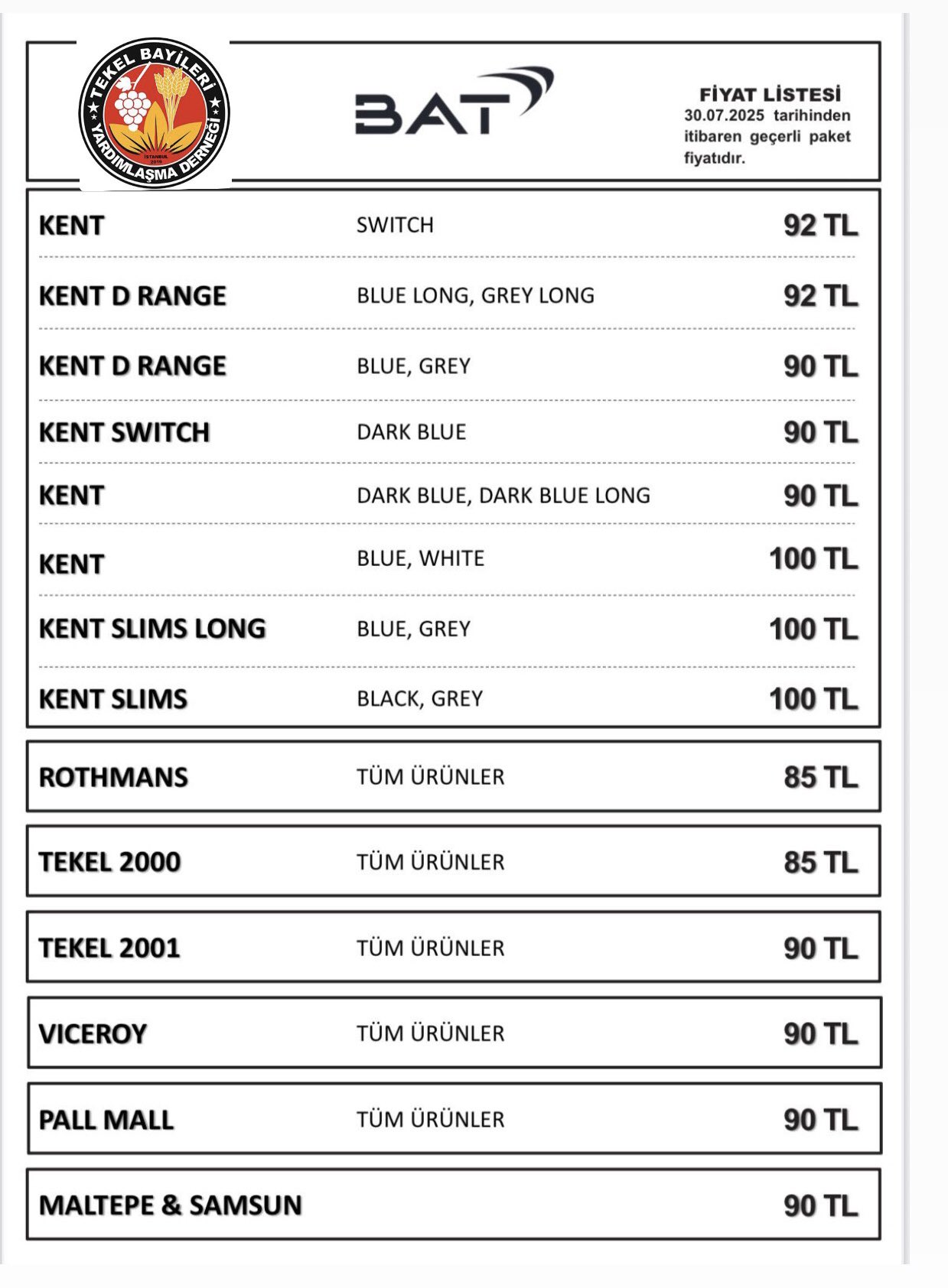Tekel Bayileri Yardımlaşma Derneği (TBYD) tarafından duyurulan güncel fiyat listesine göre, BAT grubuna ait sigaraların en düşük fiyatı 85 TL‘ye yükselirken, en pahalı sigara ise 100 TL oldu.