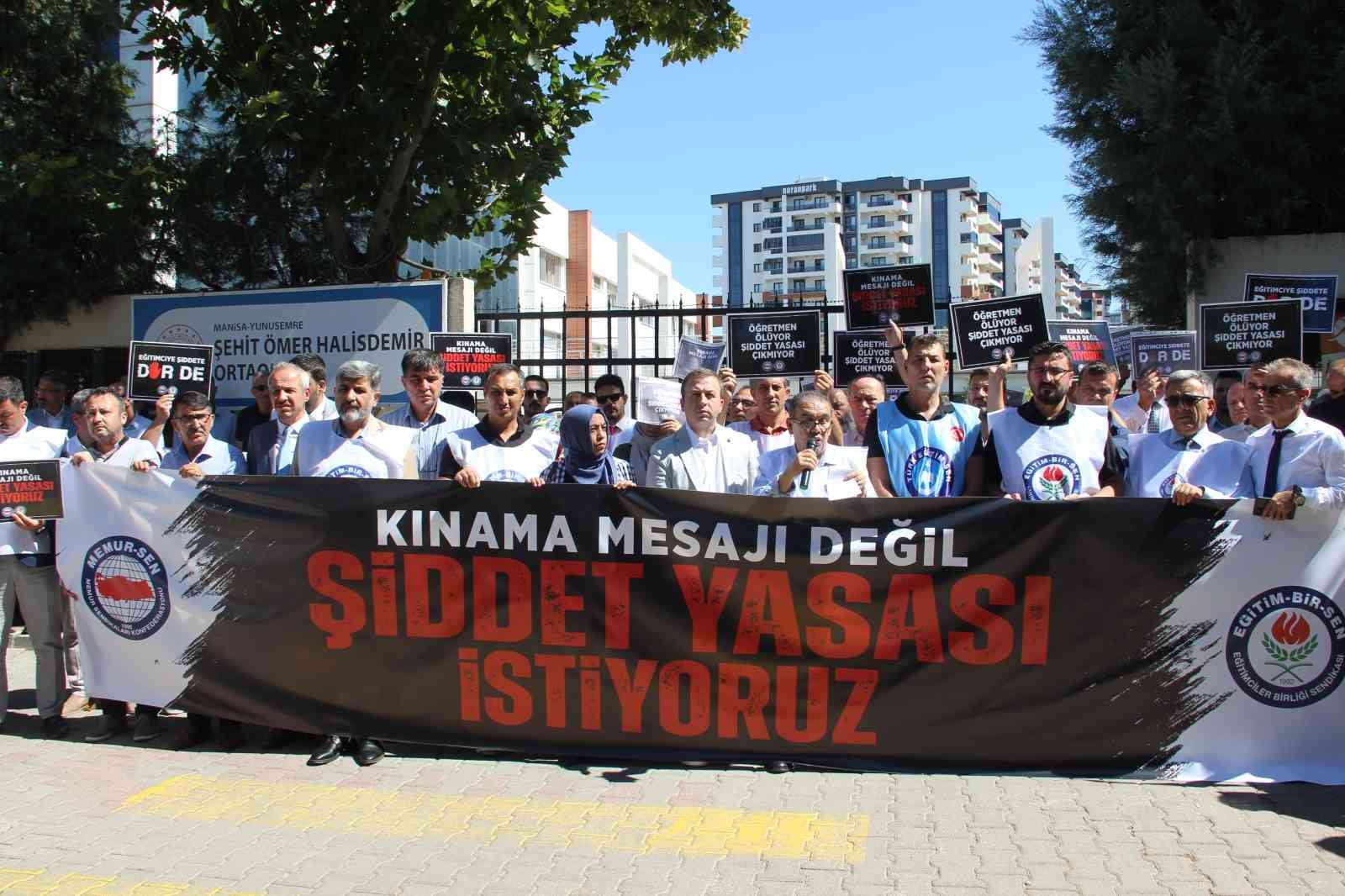 Manisa’da 11 Eylül tarihinde bir velinin okul müdürüne karşı silahlı saldırı girişiminde bulunması üzerine bir araya gelen eğitim sendikaları, “Kınama mesajı değil, şiddet yasası istiyoruz” diyerek alkışlarla okul müdürü Mustafa Örnek’e destek verdi.