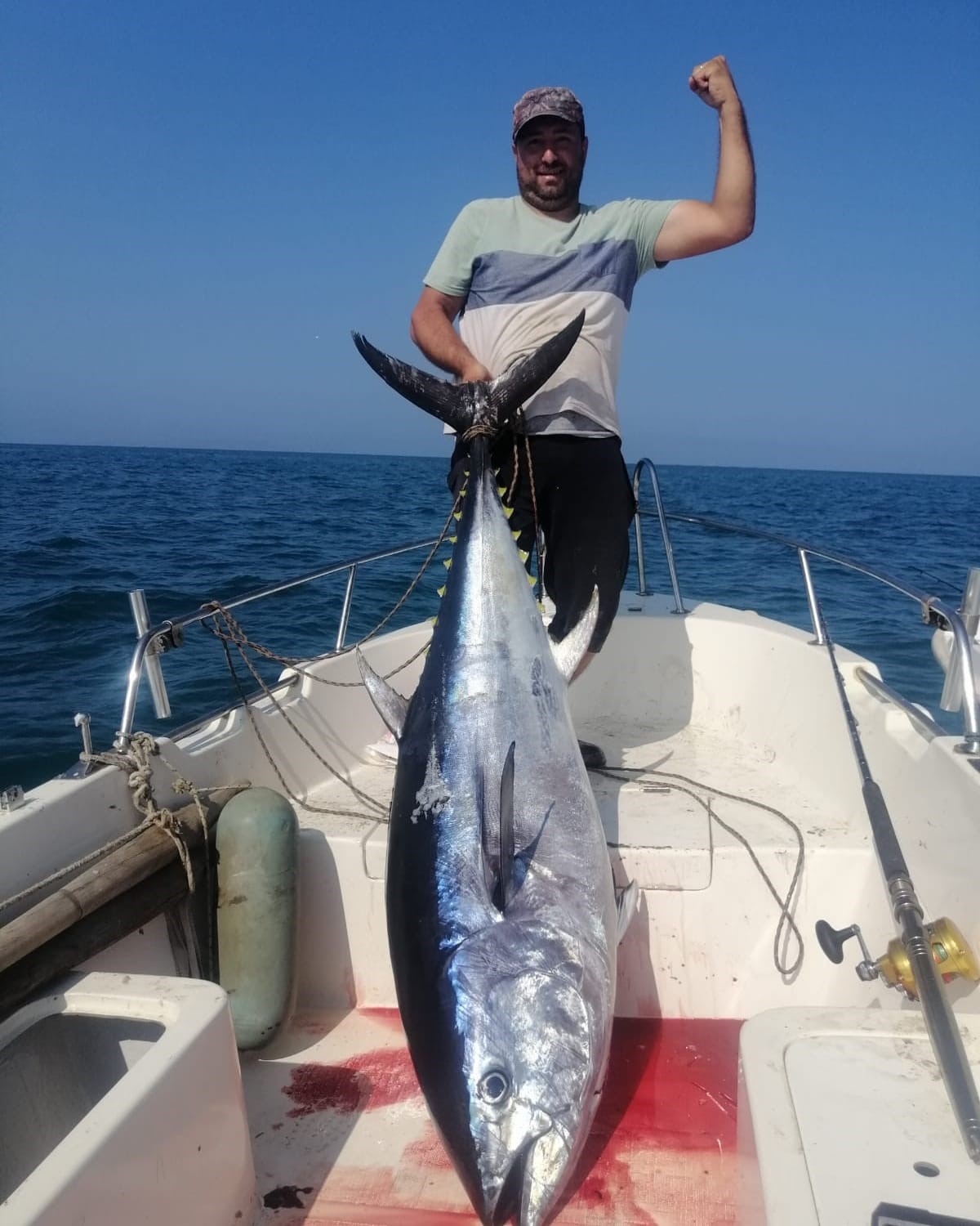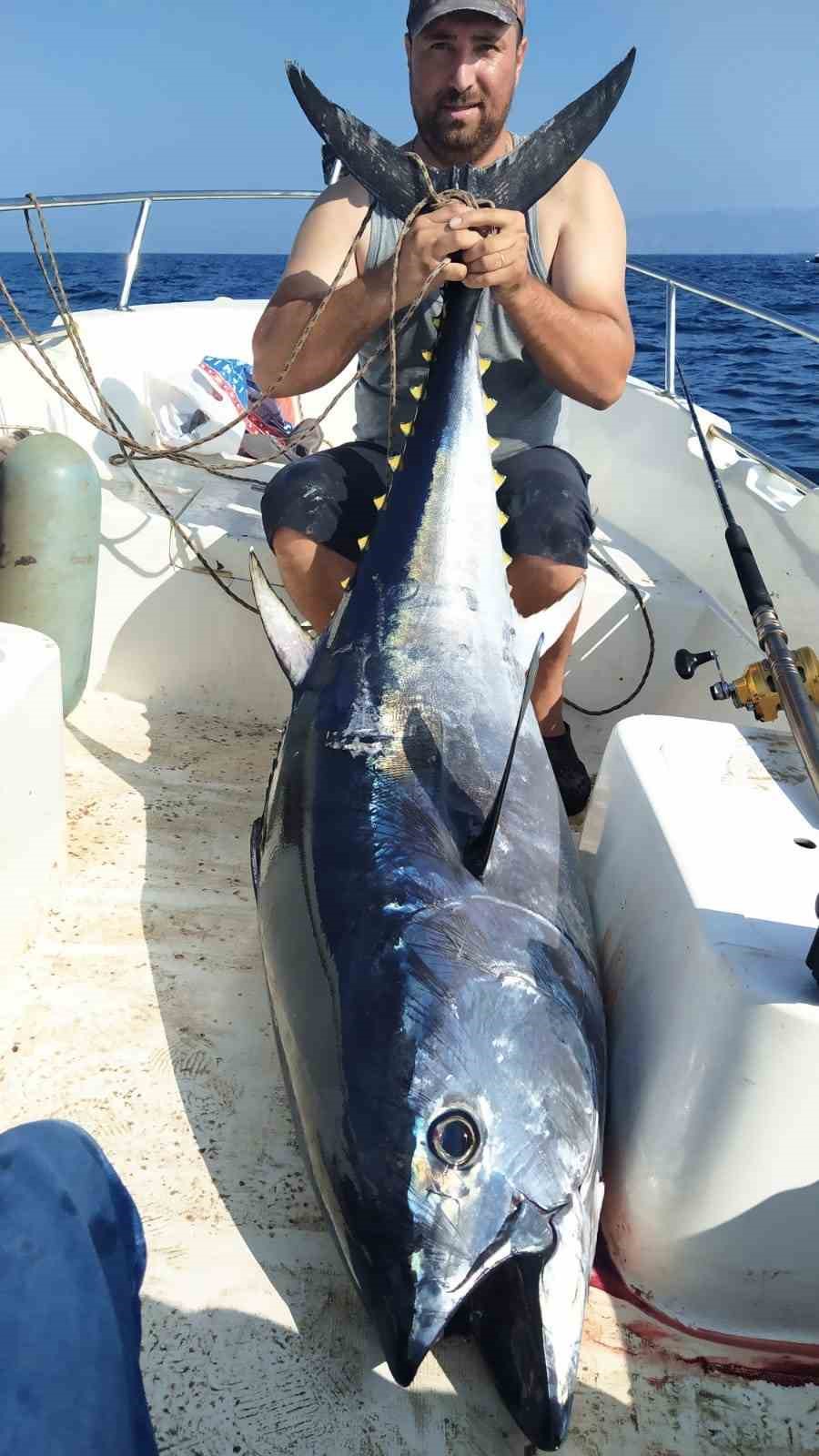 Aydın’ın Söke ilçesinde amatör su ürünleri avcılığı yapan bir balıkçı, deniz sahasında mavi yüzgeçli orkinos balığı yakaladı. Yakalanan dev balık, İlçe Tarım ve Orman Müdürlüğü Su Ürünleri ekipleri tarafından kontrol edilerek kayıt altına alındı.