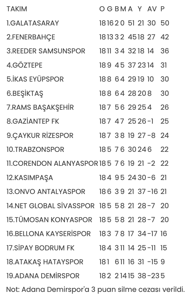 Süper Lig‘de 19. hafta maçlarının sonuçları ve oluşan puan durumu şöyle: