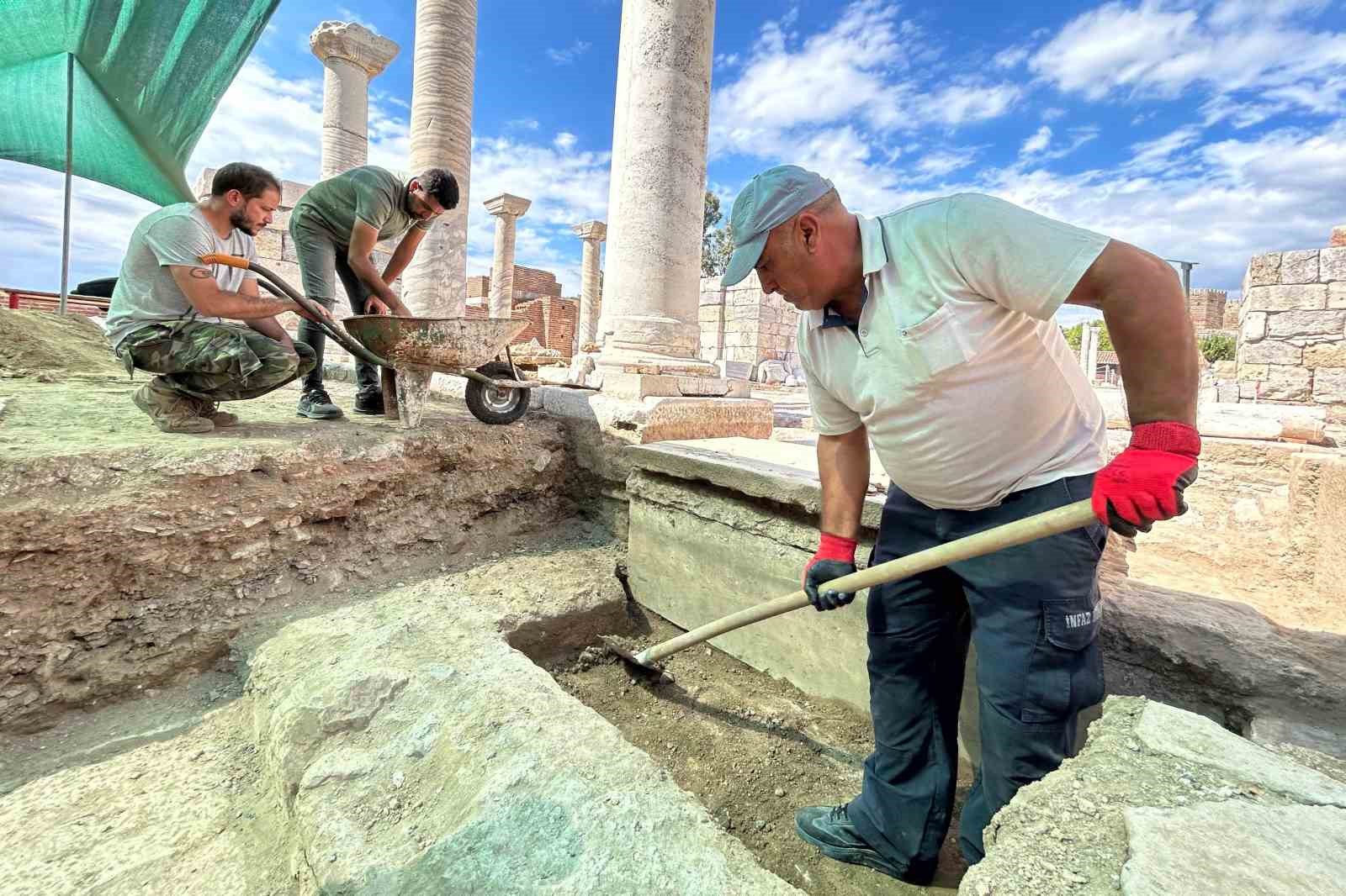 2023 yılında alanda jeoradar çalışması yaptıklarını ifade eden Mimaroğlu, daha önce burada Hörmann’ın yaptığı sondajların da bulunduğuna vurgu yaptı. Sözlerine devam eden Mimaroğlu, “Bu sondajlar sırasında ortaya çıkardığı keşifler sonucu bir takım veriler almış. Bir bu verileri teyit etmek için daha geniş bir alanda kazı yaptık. Mermer bir döşeme ortaya çıktı. En üst kısımda yer alan mermer zemin döşemesi 1. Jüstinyanus dönemine yani 6. yüzyıla ait zemin döşemesidir. Bu sene ortaya çıkanların ise 5. yüzyıla ait zemin döşemesi olduğu kanıtlanmıştır” ifadelerini kullandı.