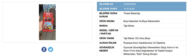 Yapılan laboratuvar incelemeleri sonucunda, Tgb Markası’na ait 12’li kuru boya setinde ciddi sağlık riskleri saptandı. Bakanlık, bu ürünün kullanımının çocuklar için “güvensiz” olduğunu resmen ilan etti.
