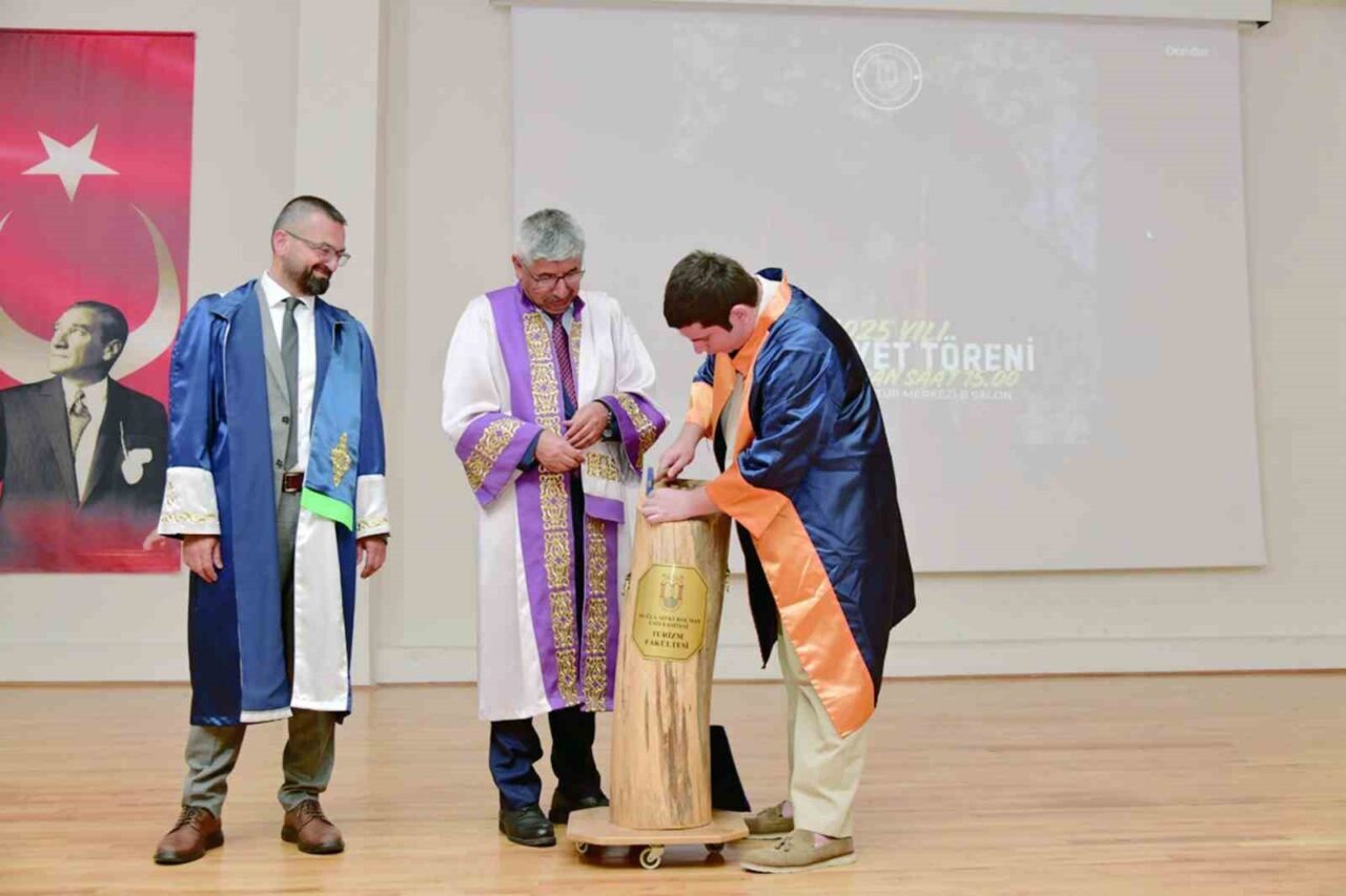 Konuşmaların ardından fakülte birincisi, mezun arkadaşlarına seslendikten sonra isim plakasını şeref kütüğüne yerleştirdi. Daha sonra dereceye giren ve mezun olan öğrencilere başarı belgeleri takdim edildi. Tören sonunda, MSKÜ’lü geleceğin turizmcileri, keplerini havaya fırlatarak mezun olmanın heyecanını yaşadı.