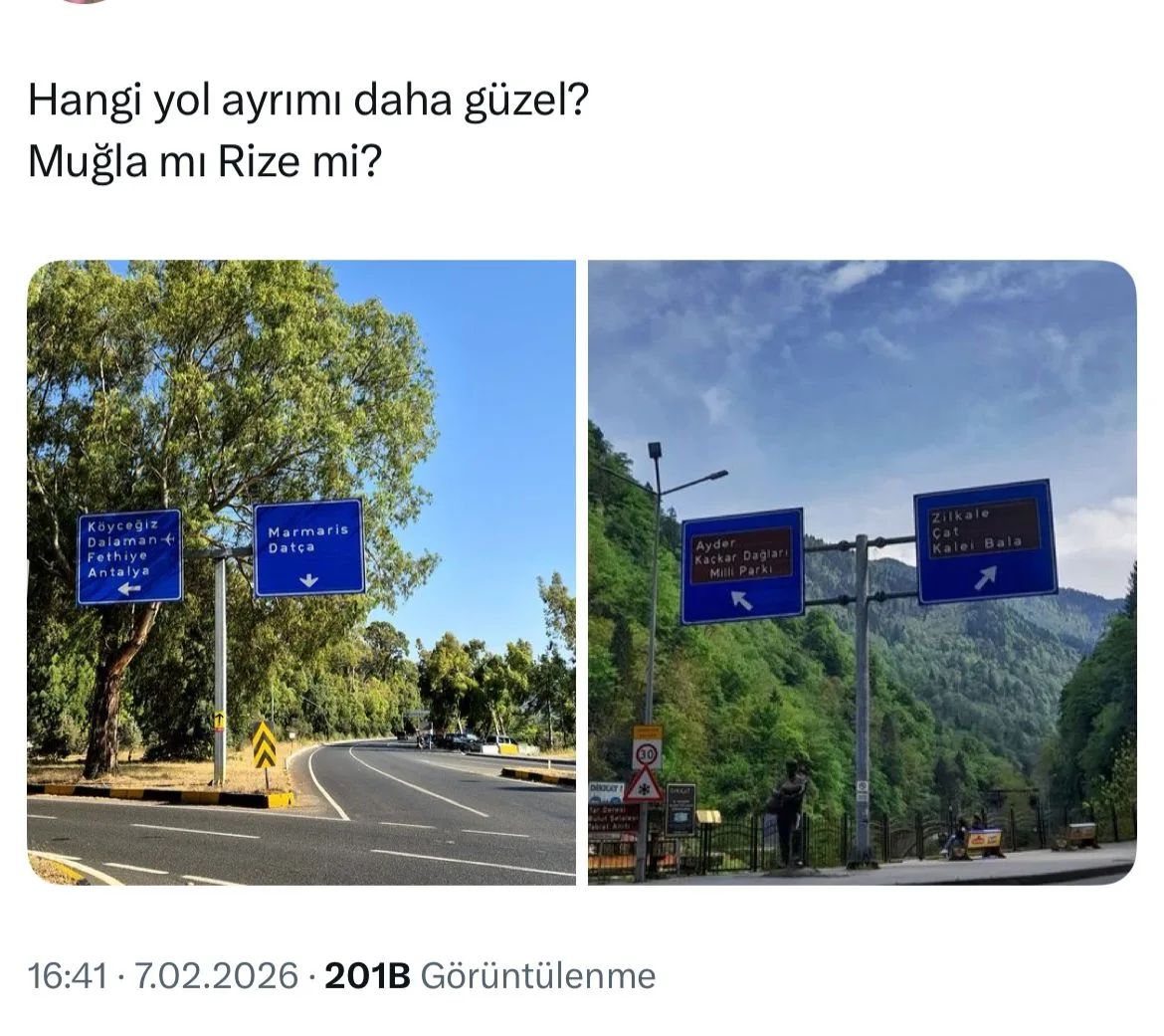 Sosyal medyada bir kullanıcının paylaştığı yol ayrımı fotoğrafı, kısa sürede büyük ilgi gördü. “Hangi yol ayrımı daha güzel? Muğla mı Rize mi?” notuyla yapılan paylaşım, binlerce beğeni ve yorum alarak Ege ile Karadeniz’i adeta sanal ortamda karşı karşıya getirdi.