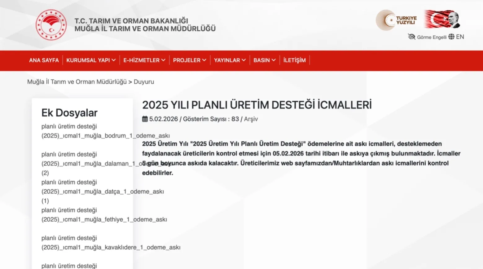 2025 yılı Temel Destek ve Planlı Üretim Desteği kapsamında hazırlanan askı icmalleri kamuoyuna duyuruldu. Muğla İl Tarım ve Orman Müdürlüğü tarafından yapılan açıklamada, destekleme listelerinin köy muhtarlıklarında, ilçe Tarım ve Orman Müdürlüklerinde ve müdürlüğün resmi internet sitesinde askıya çıkarıldığı belirtildi.