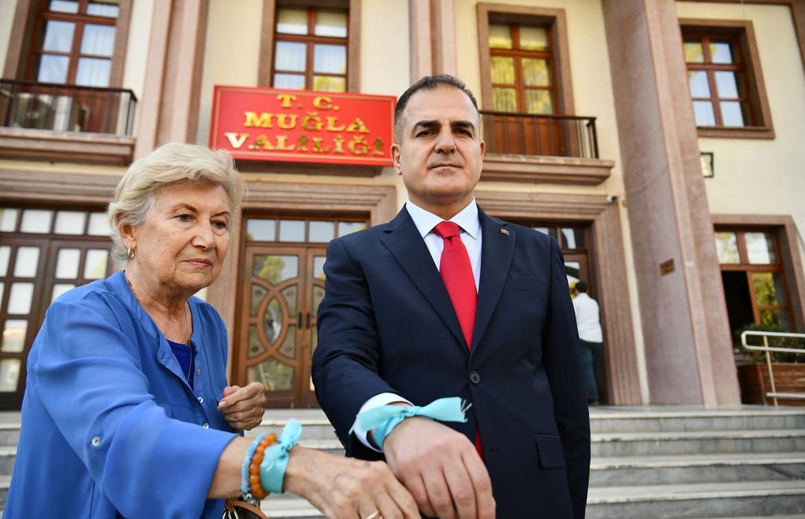 Ziyaretin sonunda Gülser Özesen, Vali Akbıyık’ın bileğine Küresel Sumud Filosu’na desteğin sembolü olan “Turkuaz Kurdele”yi taktı.