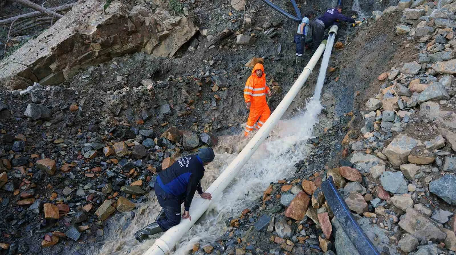 Köyceğiz’in Pınar ve Çayhisar mahallelerini besleyen ana isale hattı, yoğun yağışların ardından meydana gelen toprak kaymasıyla kullanılamaz hale geldi. Sarp arazide drone destekli operasyon yatan MUSKİ ekipleri, su iletimini yeniden sağladı.