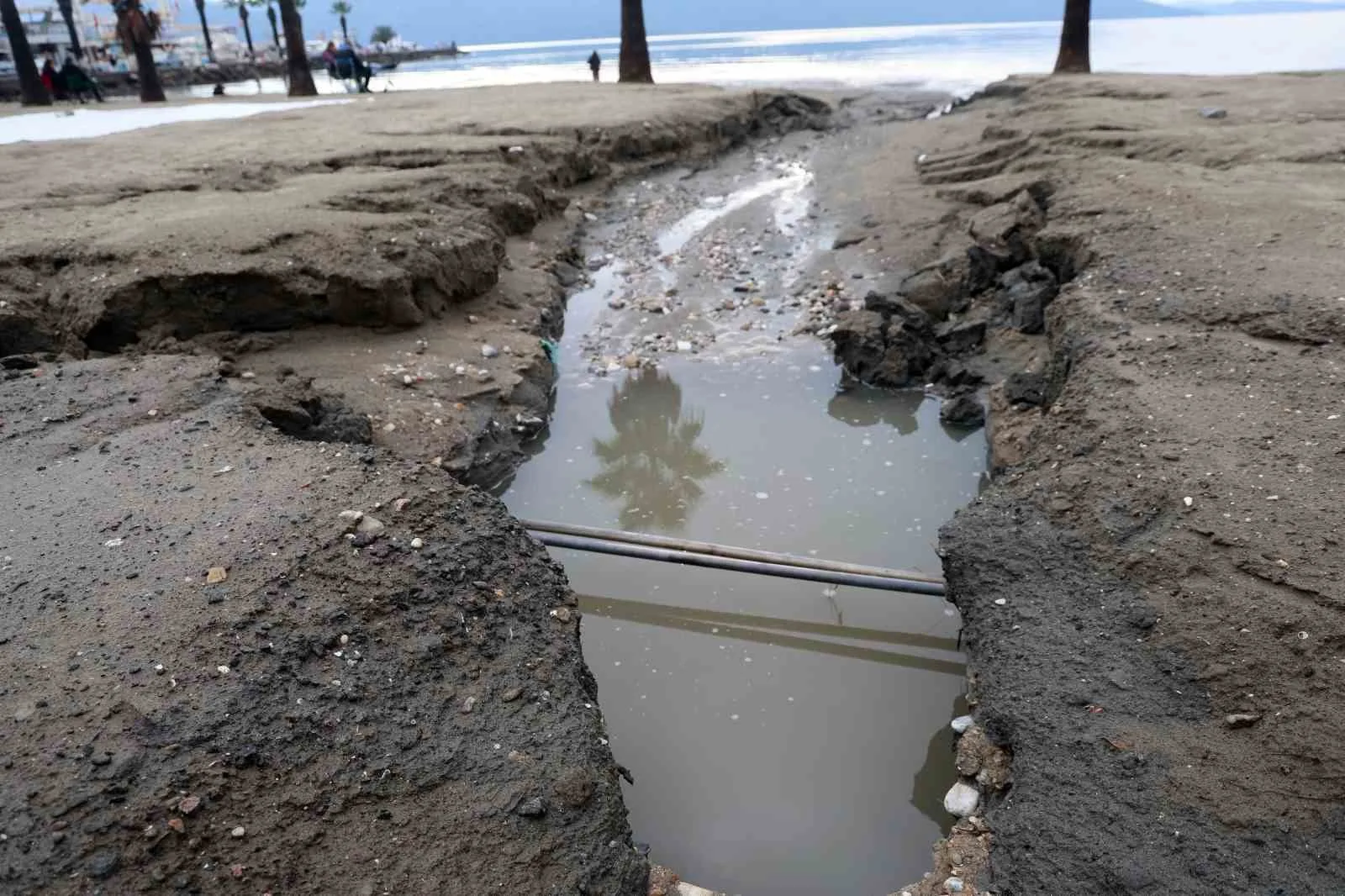 Gece saatlerinde başlayan sağanak yağmur öğle saatlerinde sona ererken, yağış nedeniyle Akyaka Mahallesi’nin iç kesimlerinden gelen yağmur suyu 300 metre uzunluğundaki Akyaka sahilinde sahil kumları denize sürüklendi ve sahilde yarıklar oluştu.